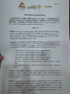 El documento fue firmado por el Dr. Octavio de la Torre de Steffano, Presidente de CONCANACO SERVYTUR México, y la Lic. Yolanda Josefina Cepeda Echeverría, Secretaria de Turismo del Estado de San Luis Potosí, contando como testigos de honor el Mtro. J. Guadalupe Torres Sánchez, Secretario de Gobierno del Estado de San Luis Potosí, y el Ing. Gerardo Charur Bendeck, Presidente de la Cámara Nacional de Comercio, Servicios y Turismo de la Huasteca Potosina.