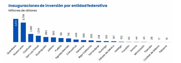 A nivel nacional, entre 2023 y 2025 se registraron 242 inauguraciones de proyectos de inversión, con un valor total de 16 mil 899 millones de dólares y una generación estimada de 111 mil 217 empleos calificados, principalmente en el sector manufacturero.