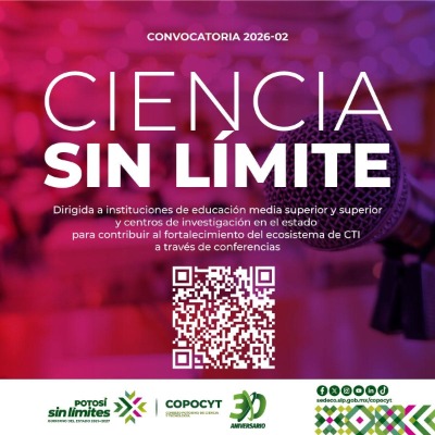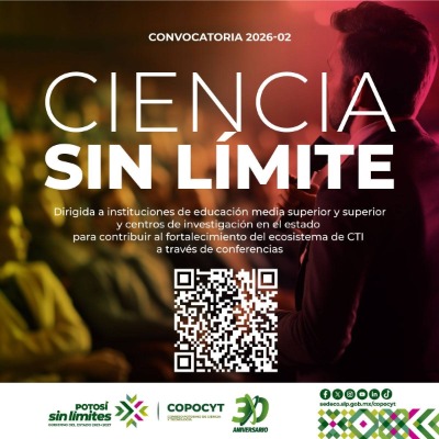 El Consejo Potosino de Ciencia y Tecnología (Copocyt) lanzó la convocatoria "Ciencia sin Límites" para instituciones de educación media superior, superior y centros de investigación. La iniciativa acerca conferencias de especialistas nacionales e internacionales, como parte del cambio que se vive y se siente en el impulso al conocimiento en San Luis Potosí.