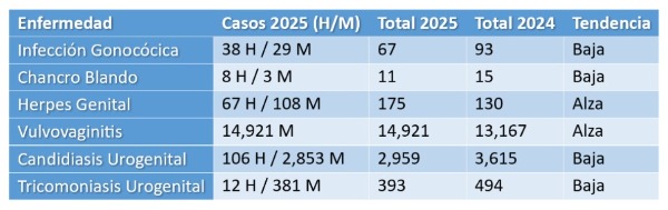 Por su parte, la sífilis adquirida también mostró una leve mejoría, cerrando la semana 52 con 593 casos acumulados (334 hombres y 259 mujeres), cifra inferior a los 644 casos del año anterior.