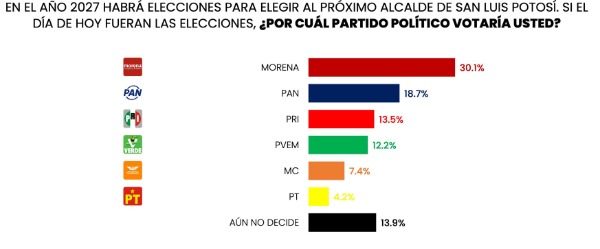 A poco más de un año de que inicie formalmente el proceso electoral municipal, la capital potosina comienza a perfilar una contienda cerrada y sin un claro favorito. De acuerdo con una encuesta realizada por Massive Caller, a cargo de Carlos Campos, con datos de enero de 2026, si hoy se eligiera al próximo alcalde de San Luis Potosí, Morena encabeza las preferencias con 30.1%, seguido del PAN con 18.7%, PRI con 13.5%, PVEM con 12.2%, Movimiento Ciudadano con 7.4% y el PT con 4.2%. Destaca que 13.9% de los encuestados aún no decide su voto, reflejando un electorado inconforme y abierto a nuevas opciones.