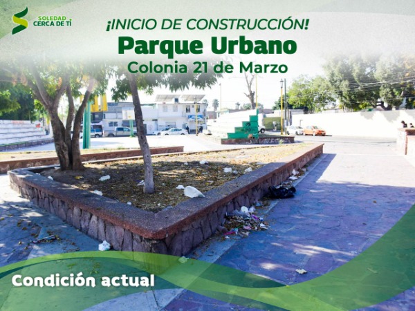 Juan Manuel Navarro Muñiz, Alcalde de Soledad de Graciano Sánchez, dio hoy el banderazo de arranque a una obra histórica y un gran anhelo social: la construcción del Parque Urbano en la colonia 21 de Marzo, con una inversión superior a los 9.3 millones de pesos que beneficiará de manera directa e indirecta a más de 14 mil 200 habitantes; este proyecto rescata un espacio abandonado y sin uso social, para convertirlo en un punto de encuentro seguro, cercano y digno para las familias, jóvenes, niñas, niños y adultos mayores del sector.