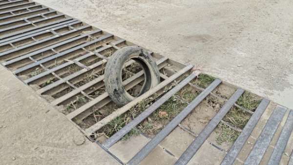 De manera improvisada, en el centro de la rejilla fue colocada una llanta aparentemente para evitar que vehículos o personas caigan dentro, sin embargo, esta medida no elimina el peligro, principalmente para motociclistas, ciclistas y peatones que transitan diariamente por la zona.