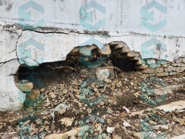 Lo que debería ser un lugar de paz y oración para la comunidad católica se ha convertido en un espectáculo dantesco para quienes transitan por la carretera Tancanhuitz-Tampamolón. Las imágenes son contundentes: enormes boquetes en la barda perimetral muestran cómo el peso de la tierra y el olvido institucional han vencido la piedra.