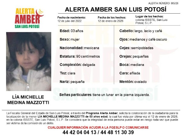 La Fiscalía General del Estado de San Luis Potosí (FGESLP) activó una ficha de Alerta Amber para la localización de Lía Michelle Medina Mazzotti, quien tuvo contacto por última vez con sus familiares el 12 de enero de 2026, en la colonia ISSSTE, de la capital potosina.
