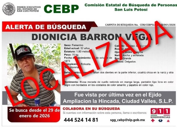 Fue este martes alrededor del mediodía cuando personal de la Comisión Estatal de Búsqueda de Personas (CEBP) encontró a Dionicia Barrón mientras caminaba sobre la avenida Pedro Antonio Santos, en dirección a la zona centro.