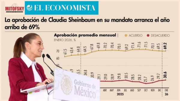 La presidenta Claudia Sheinbaum Pardo arrancó el año con una aprobación nacional promedio de 69.2%, de acuerdo con la encuesta telefónica nacional levantada por Mitofsky para El Economista, cifra 4.7 puntos superior a la registrada en enero de 2025 y 0.3 puntos menor a la de diciembre pasado.