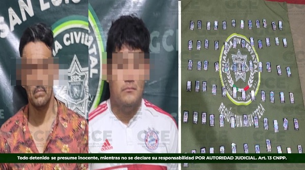 Durante la intervención policial, a los detenidos se les aseguraron 72 dosis de una sustancia granulada con características similares a la droga conocida como "cristal", así como una pipa de vidrio.