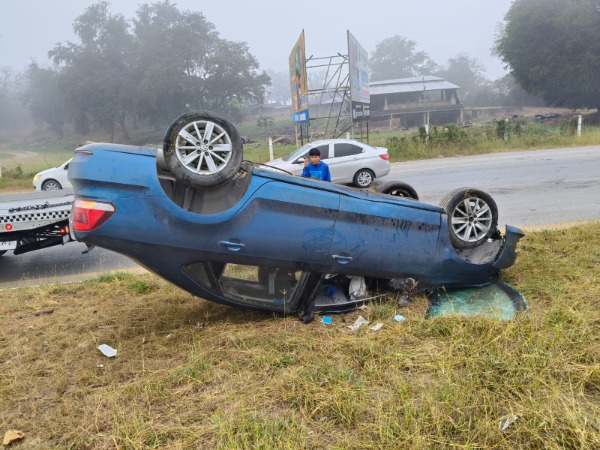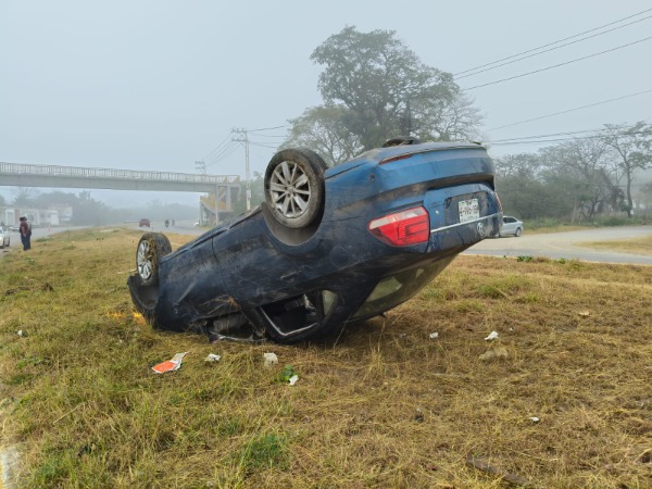 Una familia result贸 lesionada tras la volcadura de un autom贸vil ocurrida la ma帽ana de este jueves sobre la carretera federal Valles鈥揟amazunchale, a la altura del tramo ubicado entre la colonia El Gavil谩n y el Hospital General.