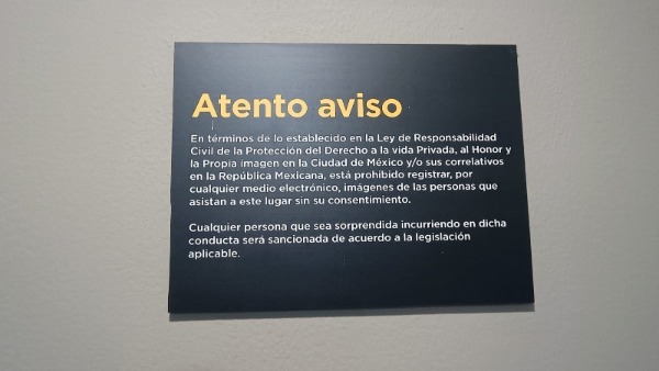 En la sucursal ubicada en Plaza Punto Novel fue visible el aviso colocado por la propia empresa, donde se advierte que, con base en la Ley de Responsabilidad Civil de la Protección del Derecho a la Vida Privada, al Honor y la Propia Imagen en la Ciudad de México y sus correlativos en la República Mexicana, está prohibido registrar imágenes de las personas que asistan al lugar sin su autorización expresa. El letrero también señala que quien incurra en esa conducta será sancionado conforme a la legislación aplicable.