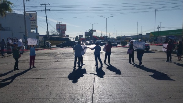 Agentes de Seguridad Vial y Movilidad de Soledad de Graciano Sánchez, prestan apoyo y brindan presencia durante una manifestación de personas por falta de agua, en avenida Camino Antiguo a Soledad próximo a Acceso Norte.