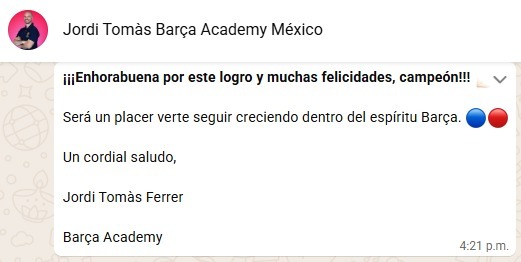 El joven futbolista de 14 años, originario de Ciudad Valles y representante de la región Huasteca, recibió la noticia mediante un mensaje del director deportivo de la Barça Academy, Jordi Tomás Ferrer, tras su destacada participación en la clínica realizada en Tampico.