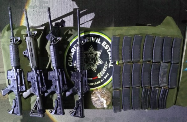 En el lugar se aseguraron cuatro armas de fuego largas calibre 5.56 milímetros, tres armas de fuego cortas, 408 cartuchos útiles calibre 5.56 milímetros, 22 cargadores, ocho placas balísticas, dos chalecos tácticos, cinco radios de comunicación, así como 20 dosis de sustancia granulada con características similares al "cristal", además de camioneta color blanco.