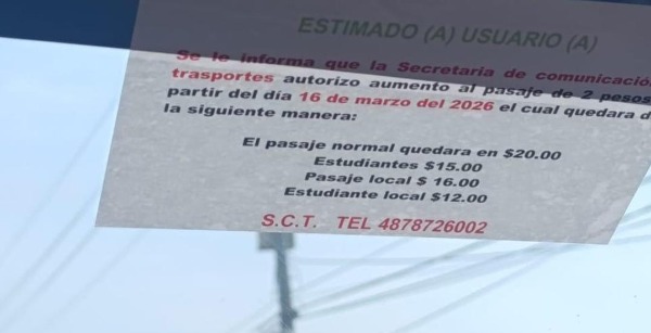 A partir del 16 de marzo de 2026, los usuarios del transporte público que cubren la ruta hacia el ejido El Refugio, en Ciudad Fernández, deberán pagar un costo mayor por el pasaje, de acuerdo con un aviso colocado en las unidades de transporte.