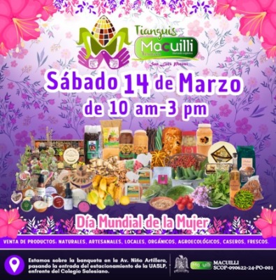 Dio a conocer que el próximo mercado se llevará a cabo el sábado 14 de marzo de 10:00 a 13:00 horas, en el que participan productores de las cuatro regiones del estado, quienes ofrecen hortalizas de temporada, miel, café de la Huasteca, quesos del Altiplano, pan artesanal y diversos alimentos procesados. La ubicación es sobre la banqueta de la calle Niño Artillero, pasando la entrada del estacionamiento de la UASLP, frente al Colegio Salesiano.