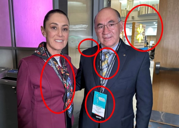Los cambios en la foto son evidentes. En la original, el alcalde vestía una corbata de cuadros marrón y amarillo; en la versión difundida aparece con rayas amarillas y azules. Además, se modificó el fondo con desenfoque para ocultar a los asistentes, se eliminaron los lentes de Galindo y se añadió digitalmente la mano de Sheinbaum sobre su hombro. También desaparecieron los gafetes oficiales del evento, aunque aún se puede ver el cordón de la presidenta.