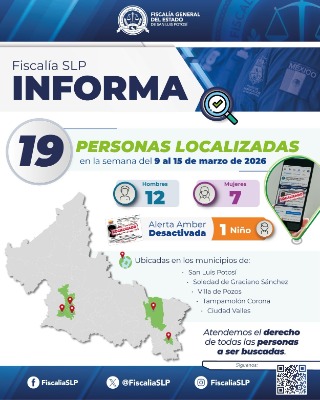 Como resultado de las acciones coordinadas de búsqueda, investigación y atención a reportes ciudadanos, la Fiscalía General del Estado de San Luis Potosí (FGESLP)logró la localización y reintegración de 19 personas a sus respectivos núcleos familiares, luego de que sus ausencias fueran previamente reportadas ante Agentes de la Fiscalía Especializada en Materia de Derechos Humanos y se generaran las correspondientes fichas de búsqueda en el territorio potosino.