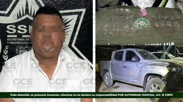 Durante trabajos de inteligencia y recorridos operativos, se detuvo a Pablo Ernesto "N", de 40 años de edad, a quien se le aseguraron 29 dosis de marihuana con un peso aproximado de 180 gramos, así como un vehículo marca Chevrolet, tipo pickup, modelo 2025.