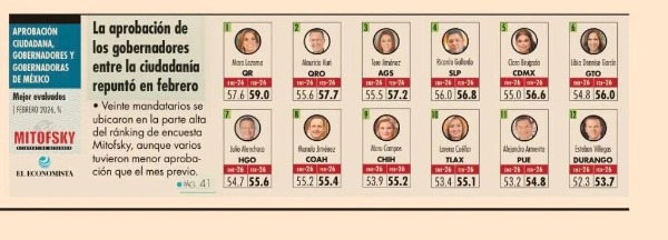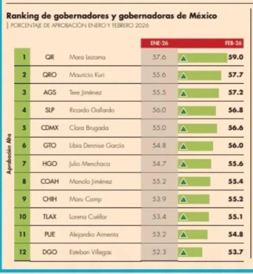 De acuerdo con el más reciente ranking de la consultora Mitofsky, el titular del Ejecutivo potosino registró un incremento en su nivel de aprobación respecto al mes anterior, colocándose únicamente por debajo de los mandatarios de Quintana Roo, Querétaro y Aguascalientes, lo que refleja la solidez de su proyecto de gobierno frente a la opinión pública.