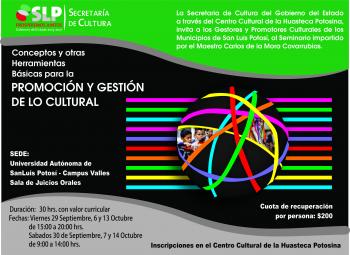 La Secretaría de Cultura del Gobierno del Estado a través del Centro Cultural de la Huasteca Potosina, invita a Gestores y Promotores Culturales de los Municipios de San Luis Potosí, al Curso Taller "CONCEPTOS Y OTRAS HERRAMIENTAS BÁSICAS PARA LA PROMOCIÓN Y GESTIÓN DE LO CULTURAL".