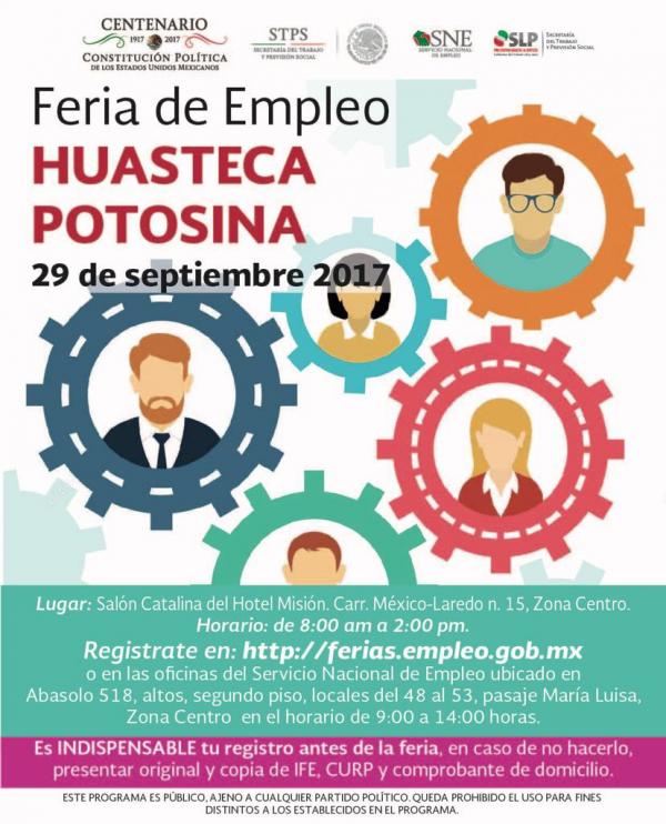 Con la finalidad de continuar con los mecanismos de vinculación entre la oferta laboral y los buscadores de empleo, la Secretaría del Trabajo y Previsión Social, a través del Servicio Nacional de Empleo, llevará a cabo una Feria de Empleo para la Zona Huasteca el próximo viernes 29 de septiembre en Ciudad Valles.