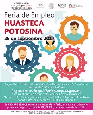 Con la finalidad de continuar con los mecanismos de vinculación entre la oferta laboral y los buscadores de empleo, la Secretaría del Trabajo y Previsión Social, a través del Servicio Nacional de Empleo, llevará a cabo una Feria de Empleo para la Zona Huasteca el próximo viernes 29 de septiembre en Ciudad Valles, donde se ofertarán más de 500 espacios de trabajo por parte de 30 empresas para continuar construyendo un San Luis Próspero.