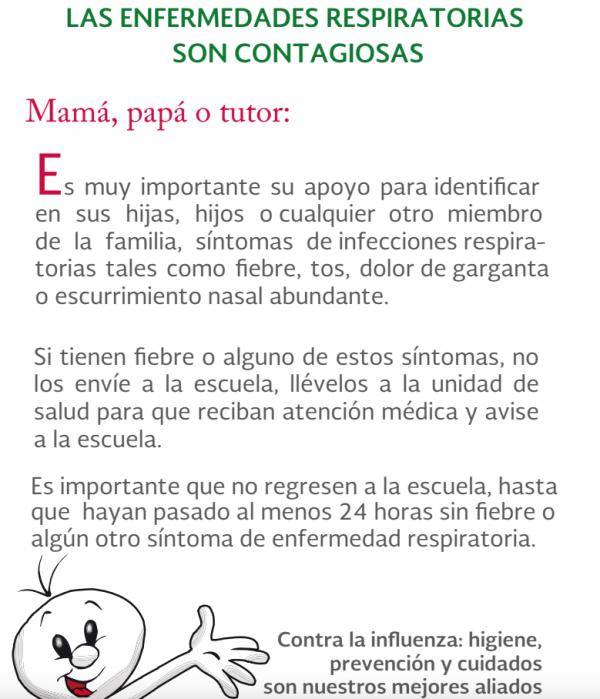 Las enfermedades respiratorias son contagiosas, por lo que la dependencia de salud pide el apoyo de la ciudadanía para identificar en sus hijas, hijos o cualquier otra persona de la familia, síntomas de infecciones respiratorias tales como fiebre, tos, dolor de garganta o escurrimiento nasal abundante.