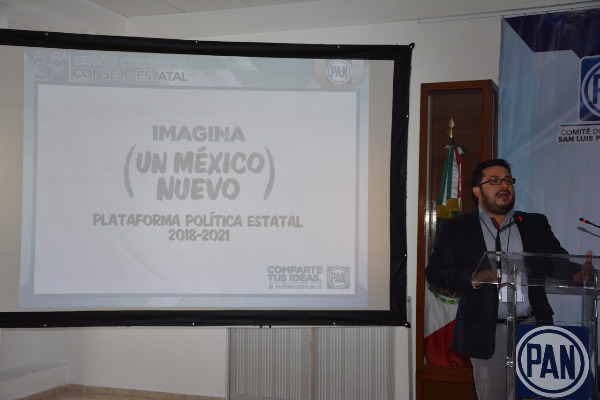 De igual forma, fue presentada la Plataforma Política Estatal 2018 – 2021, por el Secretario de Estudios Lic. Huitzilihuitl Ortega Pérez, quien comentó que el documento de propuestas esta dividido en 6 ejes rectores: "San Luis Potosí con Desarrollo e impulso económico, equitativo e incluyente, sostenible, seguro, con porvenir y con administración pública eficiente y con sentido humano, la cual de igual forma, fue aprobada por unanimidad.