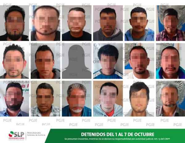 La Procuraduría General de Justicia de San Luis Potosí (PGJSLP) informó que durante la primera semana de octubre fueron aseguradas mediante mandamientos judiciales o flagrancia, 18 personas que pudieran encontrarse en conflicto con la ley, las cuales están relacionadas en delitos como secuestro, homicidio, violación, violencia familiar, robo, lesiones, abigeato y difusión ilícita de imágenes, entre otros.
