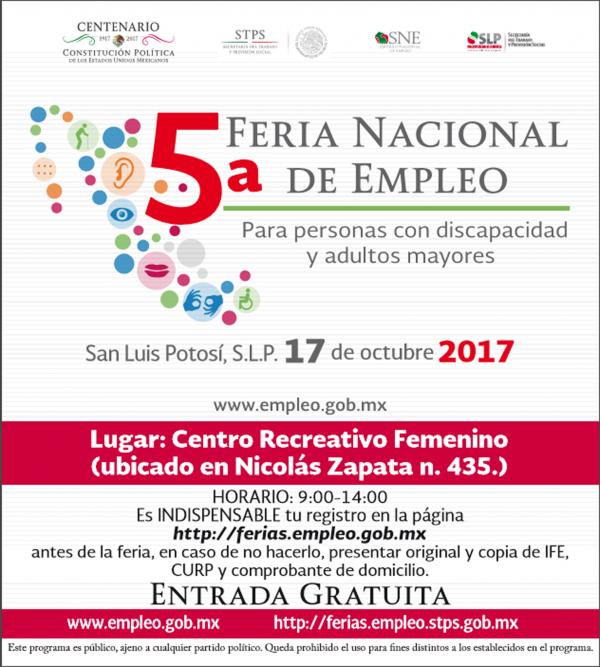 La Secretaría del Trabajo y Previsión Social, a través del Servicio Nacional de Empleo, realizará la Quinta Feria Nacional de Empleo dirigida a Personas con Discapacidad y Adultos Mayores, el martes 17 de octubre en las instalaciones del Centro Recreativo Femenino, Ubicado en Nicolás Zapata No. 435, en un horario de 9:00 a 14:00 horas.