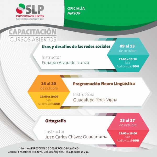 Con el objetivo de fortalecer la profesionalización de los servidores públicos para que estos a su vez ofrezcan un mejor servicio a los potosinos, durante el mes de octubre, la Oficialía Mayor impulsa la capacitación entre el capital humano, con 25 cursos una conferencia y un taller informó Elías Pesina Rodríguez titular de la dependencia.