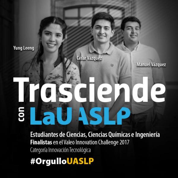 El equipo CLEY integrado por un grupo multidisciplinario de estudiantes de la Universidad Autónoma de San Luis Potosó, Yung Leeng Esperanza de Alba Chong de la carrera de Licenciatura en Química de la Facultad de Ciencias Químicas, César Eduardo Vázquez Martínez Ingeniero Mecánico Electricista de la Facultad de Ingeniería; Manuel Alejandro Vázquez Martínez de Ingeniería Biomédica de la Facultad de Ciencias, han pasado a la etapa final de proyecto Valeo Innovation Challenge 2017 en la categoría de innovación tecnológica por lo que acudirán a Francia antes del 26 de octubre a explicar su proyecto y medirse contra 7 equipos de dos categorías.