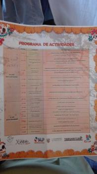 El programa incluye talleres en la Biblioteca Regional del 23 al 27 de Octubre, la Rodada Xantolo el 27, el 28 Inauguración del altar tradicional en el mercado "Constitución", así como la del Arco Tradicional. El 30 de Octubre habrá leyendas actuadas en varias bibliotecas a partir de las 10 de la mañana hasta las 19 horas, y el escritor Raúl Rivera Orta presenta su libro "Xantolo, más allá de la muerte", en el Museo Tamuantzán del Centro Cultural de la Huasteca Potosina, la inauguración del museo de la Catrina en el Hotel "El Detalle" a las 18 horas, el Desfile de Comparsas Tradicionales de los Huehues y la Inauguración Oficial de Festejos en la Plaza Principal a las 20 horas.