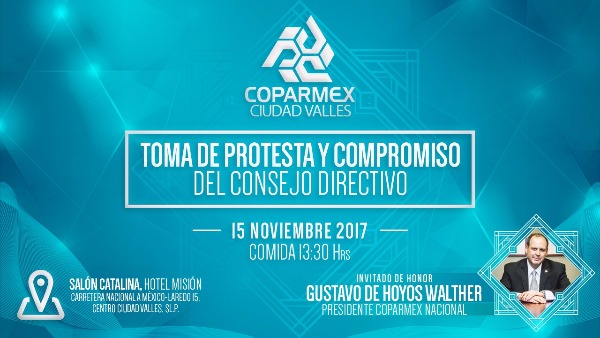 La Confederación Patronal de la República Mexicana (COPARMEX) de Ciudad Valles invita a la toma de protesta y compromiso del Consejo Directivo.
