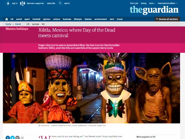 La publicación de impacto internacional da a conocer que en lo alto de las colinas de ese lugar están las tierras y las creencias de los huastecos, en sus pueblos, en granjas de café, laderas escarpadas y poderosas cascadas se prepara el Xantolo con caléndulas, calaveras de azúcar, altares con flores y decoraciones de esqueletos.