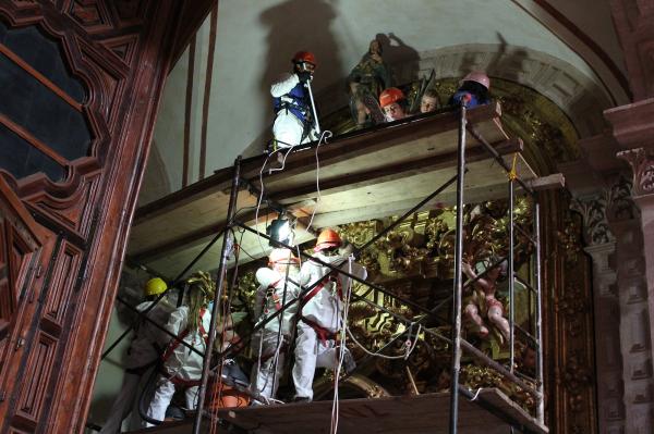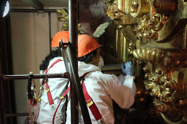 Comentaron que las actividades de la intervención emergente fueron dos, la primera basada en una consolidación en el fijado de las escamas de la lámina de oro. Una vez realizada la consolidación se hizo limpieza mecánica. La consolidación se realiza primero para evitar más deterioro. La limpieza fue mecánica, desde la parte superior hasta la inferior, y desde lo más profundo hasta la parte más externa del retablo con bronchas suaves.