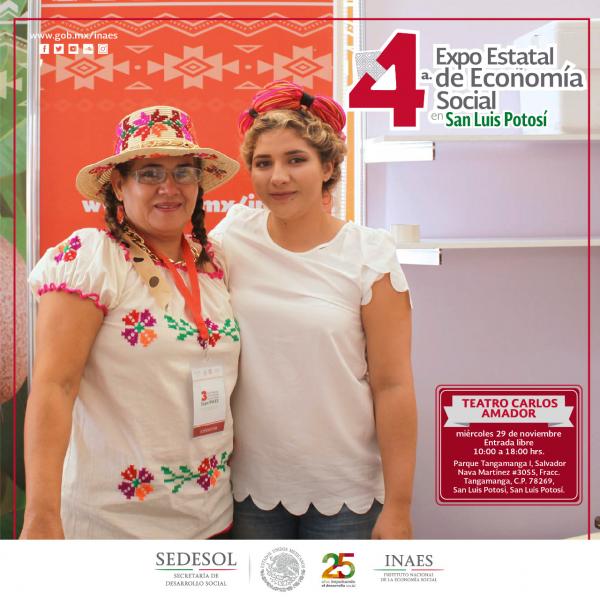 Dentro de la Estrategia Nacional de Inclusión Social, encabezada por la Secretaría de Desarrollo Social, la Delegación del Instituto Nacional de la Economía Social (INAES) en San Luis Potosí, llevará a cabo este miércoles 29 de Noviembre la "4ª Expo Estatal de Economía Social", con la participación de 49 empresas sociales que fueron apoyadas durante el 2017 por el Instituto.