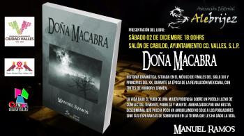 El próximo sábado 2 de Diciembre, el escritor vallense, Manuel Ramos, estará presentando su libro titulado "Doña Macabra", en un evento organizado por el Departamento de Cultura y Eventos Especiales que dirige Fernando Álvarez Martínez, y el cual es coordinado por la Fundación "Tének Mimlab Pilar Vidales A. C.", con el apoyo del H. Ayuntamiento de Ciudad Valles.