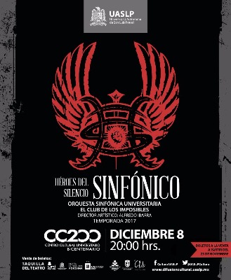 La Música clásica y el rock se fusionan para presentar Héroes del Silencio Sinfónico, este viernes 08 de diciembre en el Centro Cultural Universitario (CC200) a las 20:00 hrs. la Orquesta Sinfónica Universitaria y la banda de rock potosina El club de los Imposibles, se funden en una sola melodía para deleitarnos con un repertorio fenomenal.