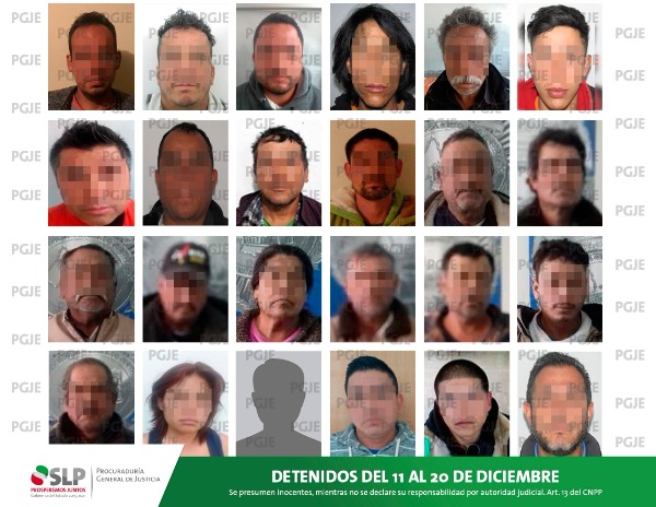 La Procuraduría General de Justicia de San Luis Potosí (PGJSLP) informó que en el periodo comprendido del 11 al 20 de diciembre, agentes ministeriales aseguraron a 24 personas por diversos delitos; con esto se dio cumplimiento a 11 órdenes de aprehensión y 13 detenciones en flagrancia.