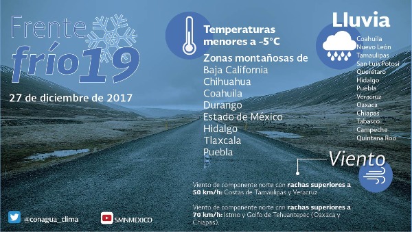 La dependencia detalló que el fenómeno, que se extiende desde el sur de Estados Unidos de América hasta el sur de Veracruz, y a la masa de aire que lo impulsa, mantendrán las bajas temperaturas en gran parte de México con bancos de niebla o neblina en el noreste, el centro y el oriente del país.
