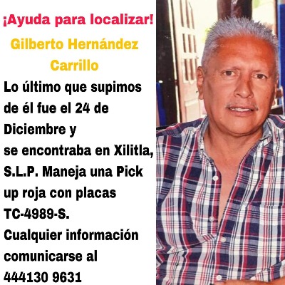 En las redes sociales empezó a circular la fotografía de Gilberto Hernández Carrillo, quien se encuentra desaparecido desde el 24 de diciembre de 2017, y sus familiares al parecer también pidieron ayuda a las autoridades policiacas.