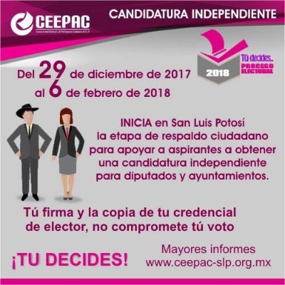 Da a conocer el Consejo Estatal Electoral y de Participación Ciudadana-CEEPAC que a partir del día de hoy comenzó el periodo de respaldo de firmas para quienes buscan obtener una candidatura como independientes, esto como parte del periodo electoral 2018.