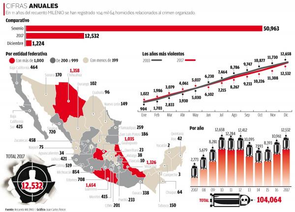 El recrudecimiento de la violencia por la lucha entre los cárteles de la droga en 2017 dejó un saldo de 12 mil 532 víctimas, cifra más alta en lo que va del sexenio, y sólo superada por los 12 mil 658 asesinatos reportados en 2010, de acuerdo con el recuento que se publica cada mes desde enero de 2007.