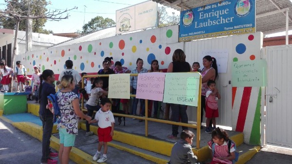 Esta mañana madres de familia del Kinder Enrique Laubscher de la colonia García Téllez se manifestaron en la entrada del plantel, donde exigen que se les asignen más maestros y que les asignen personal de intendencia.