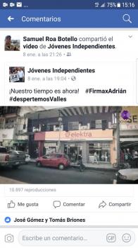 Después de que el grupo denominado "Jóvenes Independientes" subiera a la plataforma de Facebook un video donde se apoya al precandidato independiente Adrián Esper Cárdenas, el pasado 8 de Enero, logró llegar a 11 mil reproducciones en menos de un día, lo que significa que lleva un alto porcentaje en las encuestas de ser el próximo Presidente Municipal.