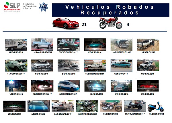 La corporación policial informó que entre las unidades recuperadas se encuentran camionetas, automóviles, motocicletas, motonetas y coches de servicio público particular, por lo que refrendó su compromiso para continuar consolidando esquemas que brinden mayor seguridad a las familias potosinas.