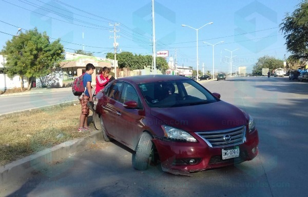 Un vehículo Nissan Sentra color guinda, de modelo reciente, derrapó y chocó contra el camellón en la avenida Universidad a unos metros de la agencia cervecera Corona.