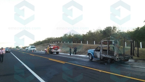 En el kilómetro 72 del libramiento Valles-Tamuín, cerca del ejido La Pitaya, se registró el incendio se una camioneta marca Dodge color azul, con redilas, de modelo atrasado.