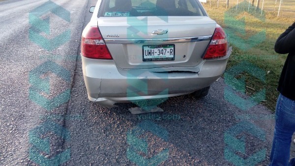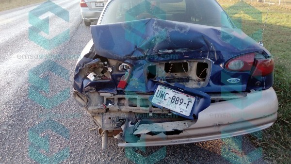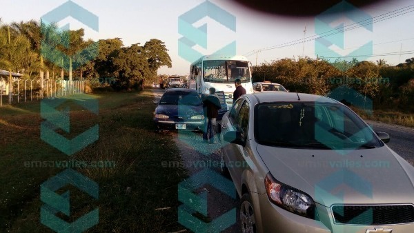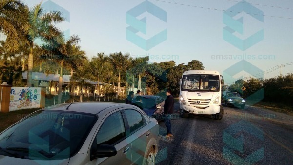 Hace apenas unos minutos un autobús urbano de la ruta Santa Rosa-Hospital, chocó por alcance contra un automóvil Ford azul, y lo lanzó contra un Chevrolet arena, en la carretera Valles-Tamazunchale, frente al baleario Splash Quinta Rosy.
